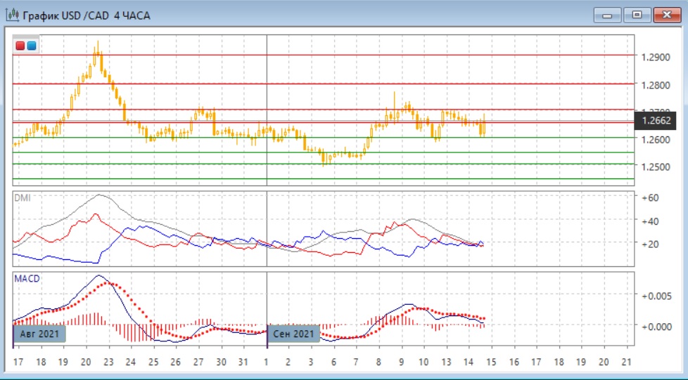 На четырёхчасовом графике можно выделить более узкий диапазон 1,2600-1,2700. Резкий отскок вверх от нижней границы может привести пару обратно к верхней границе на 1,2700. Однако в более широкой перспективе пара скорее снизится от верхней границы более широкого диапазона 1,2700. При преодолении уровня 1,2600 можно ожидать движения к минимуму сентября около 1,2500.