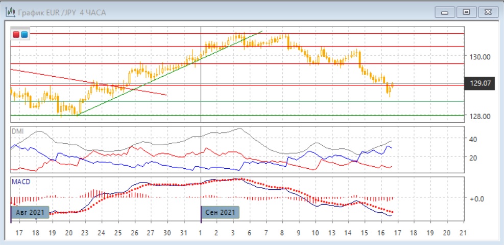 На четырёхчасовом графике после выхода вниз из диапазона 129,70-130,30 снижение было достаточно быстрым. Преодоление уровня поддержки 129,00, который был дальше цели измеренного движения, равной размеру диапазона, может показывать, что тенденция является сильной. По индикаторам направленного движения тенденция снижения также усилилась: превышение DM- над DM+ увеличилось, ADX на высоком уровне и растёт, гистограмма MACD находится в отрицательной зоне, линия MACD имеет отрицательный наклон. При отскоке вверх уровень 129,00 выступает уже сопротивлением. Однако образование большой нижней тени свечи 16 сентября может быть показателем, что волна снижения подходит к концу.