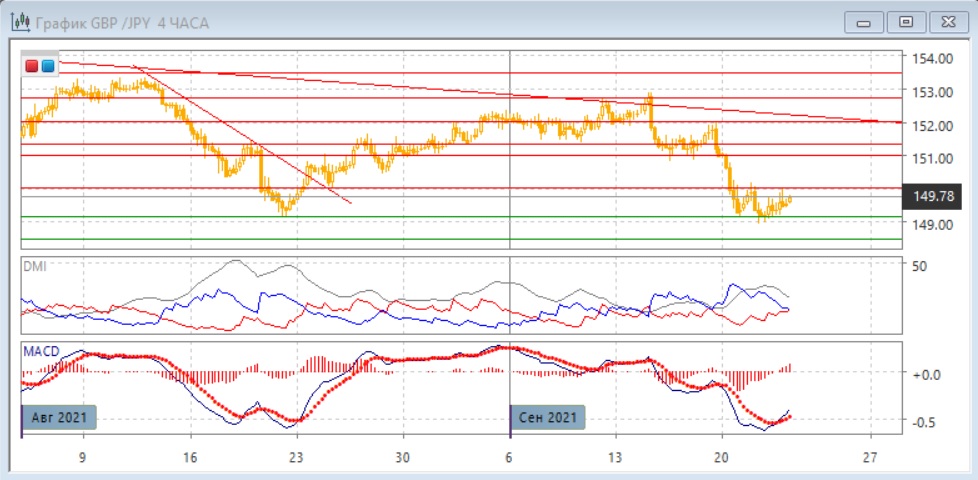 На четырёхчасовом графике пара консолидируется после снижения в диапазоне 149,15-150,00. Исходя из движения в консолидации, более вероятно снижение к нижней границе, так как пара уже снизилась от верхней. Так как это может быть "флагом", фигурой продолжения, более вероятный выход из консолидации вниз. Лучшей действовать в сторону фактического выхода пары из диапазона 149,15-150,00.