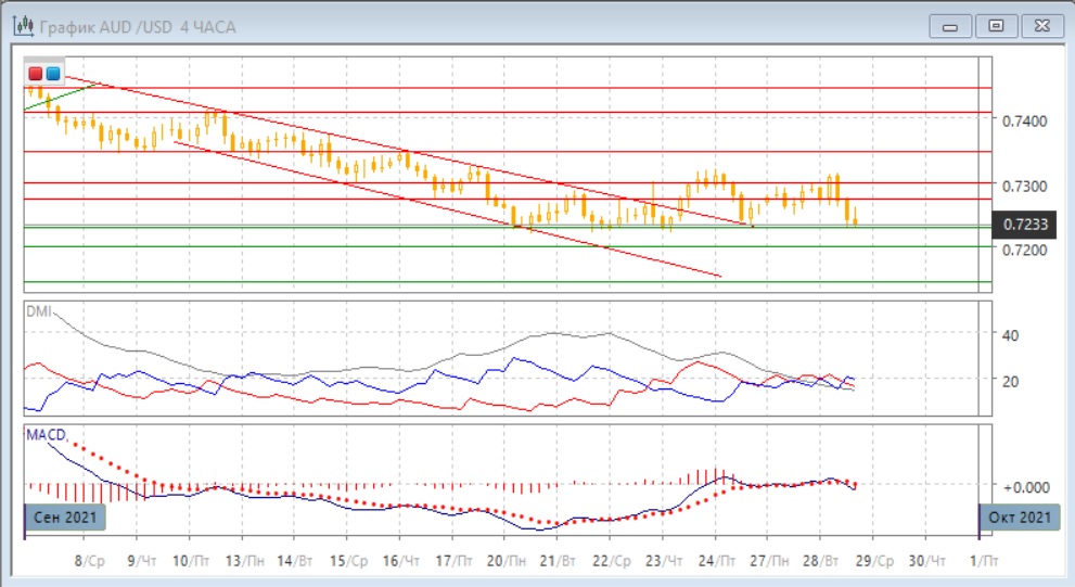На четырёхчасовом графике пара находится у нижней границы диапазона 0,7230-0,7300, в котором пара находится с 20 сентября. Исходя из движения в диапазоне, вероятен рост к верхней границе, так как пара уже достигла нижней границы. По индикаторам направленного движения в этом масштабе флэт: DM- и DM+ пересекаются, уровень ADX низкий, гистограмма MACD около нуля, наклон линии MACD слабый. При преодолении 0,7230 пара может быстро снизиться (так как остановка пары в диапазоне задержалась), но до преодоления 0,7230 рассчитывать на снижение опасно, так как пара находится у сильного уровня поддержки.