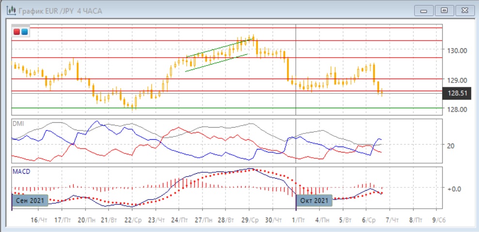 На четырёхчасовом графике пара остаётся ниже уровня 128,60. Таким образом, если рассматривать рост от 128,60 с 1 октября как коррекцию к волне снижения с 29 сентября, она закончилась, и пара возобновила снижение. До 128,00 сильного уровня поддержки не видно, и скорее пара достигнет этого уровня. С точки зрения импульса важно, что снижение 6 октября было резким, и размер свечей был значительно больше свечей в волне роста. Направлением наименьшего сопротивления сейчас явно является снижение.