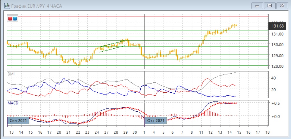 На четырёхчасовом графике пара вышла из консолидации 130,70-131,30 вверх, и продолжение роста остаётся предпочтительным. Но в этом масштабе уже видно замедление: образовалось медвежье расхождение максимумов пары и гистограммы MACD, это увеличивает вероятность отката. При откате ближайшей поддержки можно ожидать на ранее преодолённом уровне сопротивления 131,30. По ADX рост является сильной тенденцией - превышение DM+ над DM- большое при высоком и растущем уровне ADX.