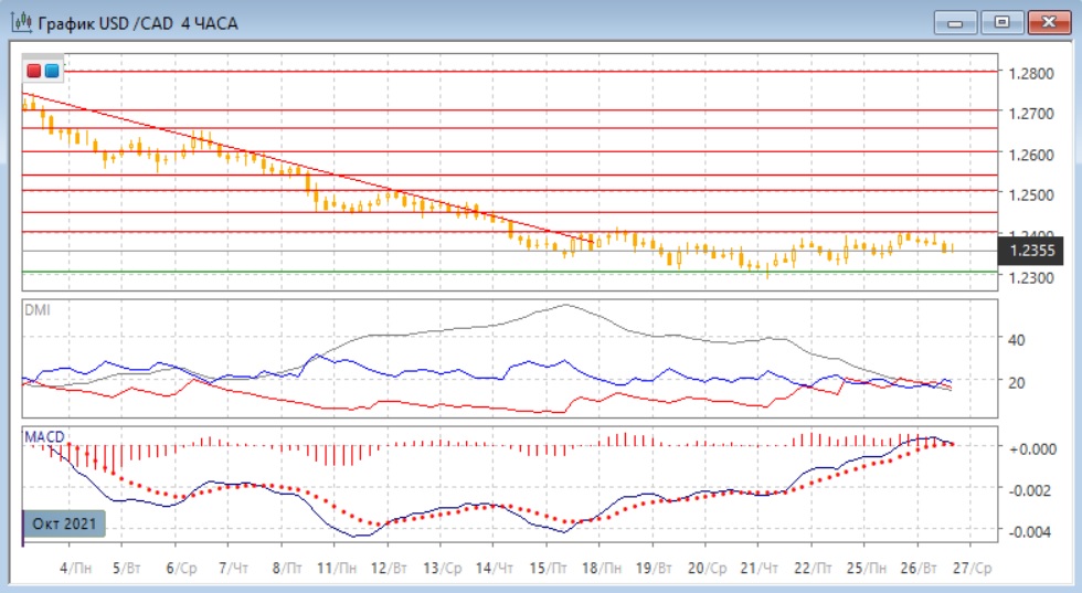На четырёхчасовом графике пара продолжает находиться в диапазоне 1,2300-1,2400. Сейчас она снижается от верхней границы, и более вероятным кажется достижение нижней границы. Медвежьим сигналом является образование небольшой "падающей звезды" ниже 1,2400. По индикаторам направленного движения в этом масштабе флэт (что соответствует диапазону): DM+ и DM- пересекаются при низком уровне ADX. По более краткосрочным индикаторам пара переходит к снижению: гистограмма MACD снижается, линия MACD перешла к горизонтали.