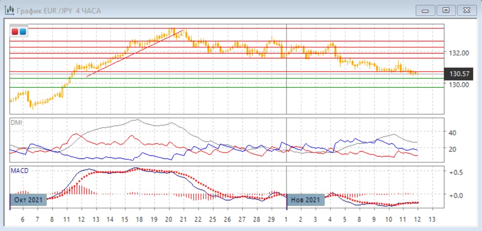На четырёхчасовом графике после тестирования уровня 130,70 в течение 5-11 ноября пара, кажется, преодолевает этот уровень. Так как пара вышла вниз из диапазона 130,70-131,60, целью измеренного движения может быть уровень 129,80. Это примерно соответствует уровню поддержки 129,70. По ADX тенденция снижения сохраняется: DM- устойчиво выше DM+. Снижение относительных максимумов и минимумов пары сохраняется. Образовалось ещё одно бычье расхождение минимумов пары и гистограммы MACD, но этот сигнал не имеет подтверждения.