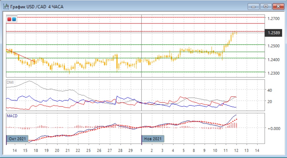 На четырёхчасовом графике рост ускорился - от медленного продвижения к относительно большими откатами пара с 10 ноября выросла без откатов сразу на 200 пунктов (от 1,24 до 1,26). С одной стороны, это показывает усиление тенденции и в продолжении роста можно быть уверенным сильнее, но с другой стороны, размер волны предполагает, что назревает откат. Однако даже если он случится, продолжение роста кажется сейчас предпочтительным. Отсутствие отката от уровня 1,2600 сейчас также показывает, что поддержке даже для коррекционного снижения пока нет. По индикаторам направленного движения рост является сильной тенденцией: превышение DM+ над DM- увеличилось, гистограмма MACD находится в положительной зоне, линия MACD имеет положительный наклон.