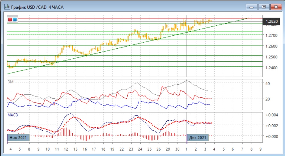 На дневном графике пара преодолена уровень 1,2800, был достигнут новый максимум. Преодоление сильного уровня поддержки показывает, что несмотря на предпосылки для отката, достаточного сопротивления для роста пока нет. Пара остаётся выше линии тренда, сохраняется последовательность роста относительных максимумов и минимумов пары. По индикаторам направленного движения тенденция остаётся сильной: превышение DM+ над DM- очень большое при высоком уровне ADX, гистограмма MACD в положительный зоне, линия MACD имеет положительный наклон. Однако обстоятельства, увеличивающие вероятность отката, и делающие рискованным расчёт на дальнейший рост, сохраняются: пара с конца октябре движется без существенных откатов, размер волны роста достиг 550 пунктов, что очень много для пары.