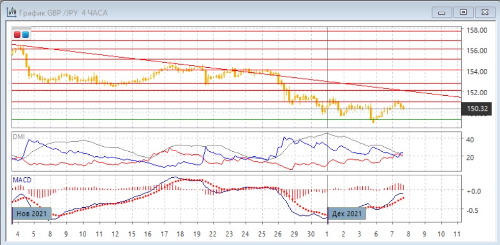 На четырёхчасовом графике снижение сменилось диапазоном 149,25-151,00. Последовательность снижения относительных максимумов пары была нарушена. Это может говорить о стабилизации выше 149,25, хотя это не является само по себе разворотом. С приближением линии тренда давление в сторону снижения может увеличиться. Пока, если рассматривать движение в диапазоне, пара может снизиться к нижней границе 149,25.