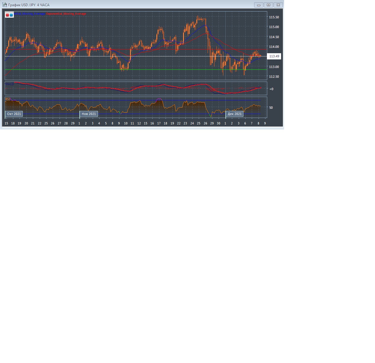 Скользящие средние с периодом 21 и 55 дней замедляются и разворачиваются вверх, сокращая расхождение. Четырёхчасовой график прогрессирует между экспоненциальных скользящих средних, демонстрируя равный потенциал продавцов и покупателей на этом рынке в краткосрочной перспективе.
