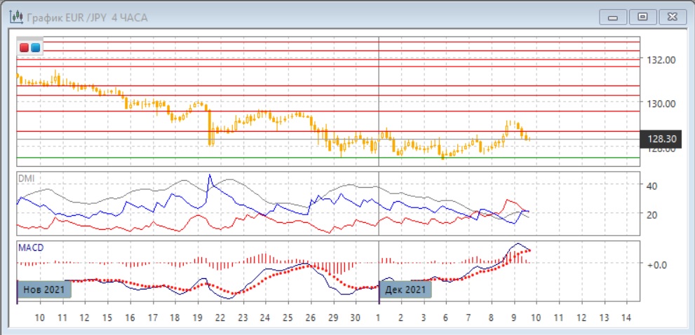 На дневном графике пара после закрытия выше верхней границы консолидации между 127,50 и 128,70 может вернуться обратно в этот диапазон. Тем не менее, сам факт преодоления уровня сопротивления увеличивает вероятность более значительного отскока вверх. Уровень 128,00 сейчас можно рассматривать ближайшей поддержкой. Также важно, что пара преодолела предыдущий максимум у 128,70. По индикаторам направленного движения коррекция к снижению: превышение DM- над DM+ сохраняется, но гистограмма MACD перешла в положительную зону, линия MACD разворачивается.