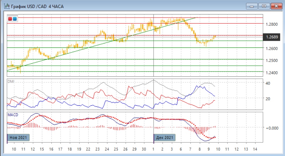 На дневном графике пара получила поддержку у "круглого" уровня 1,2600. Выше образовался "молот", который может быть подтверждён свечой в четверг, что может быть сигналом продолжения отскока. Однако в более широкой перспективе рост от 1,2600 является коррекционным, и более вероятным кажется возобновление снижения. По индикаторам направленного движения тенденцией становится снижение: превышение DM+ над DM- уже нет, гистограмма MACD снижается в отрицательной зоне, линия MACD получила отрицательный наклон.