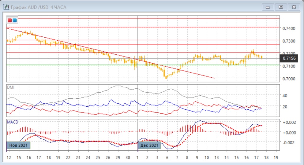 На дневном графике пара восстановилась после отката от 0,7200, однако этот уровень не был преодолён. Пара остаётся между "круглыми" уровнями 0,7100 и 0,7200. Если рассматривать прокол уровня 0,7200 как ложный пробой, то в рамках движения в диапазоне более вероятно снижение до нижней границы на 0,7100. В более широкой перспективе рост кажется предпочтителен, так как направление после преодоления линии тренда изменилось. Относительные максимумы и минимумы пары сейчас растут. По индикаторам направленного движения тенденция меняется: превышения DM- над DM+ уже нет, гистограмма MACD растёт в положительной зоне, линия MACD имеет положительный наклон.