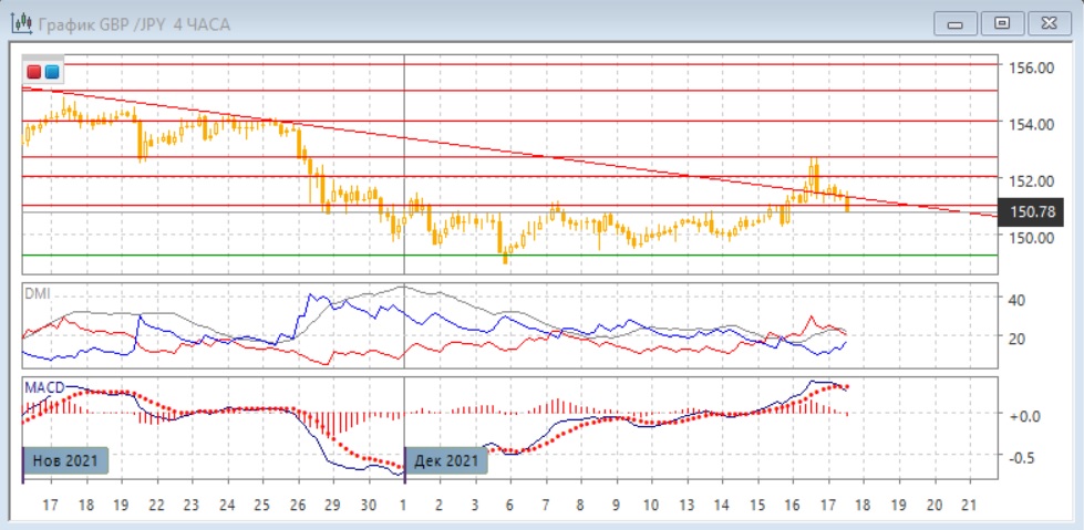 На четырёхчасовом графике продолжается вышла вверх из диапазона 149,25-151,00, но сейчас, возвращается в него. Если пара останется ниже 151,00, это было бы медвежьим сигналом в краткосрочной перспективе, так как пара снизилась бы ниже линии тренда и вернулась в канал, в котором находилась большую часть декабря. А в рамках движения в канале предпочтительным бы было снижение. Восстановление пары выше линии тренда сделало бы рост в краткосрочной перспективе более вероятным.