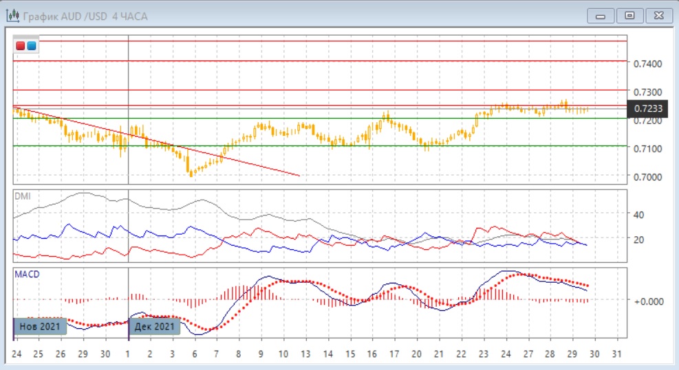 На дневном графике пара осталась выше верхней границы консолидации 0,7100-0,7200, текущий флаг можно определить между 0,7200 и 0,7240. Консолидация выше диапазона 0,7100-0,7200 предполагает, что продолжение роста более вероятно. Пара достигла нового максимума, и последовательность роста относительных максимумов и минимумов пары сохраняется. Ближайшей целью остаётся следующий "круглый" уровень 0,7300. По индикаторам направленного движения тенденцией остаётся рост: DM+ выше DM-, гистограмма MACD находится в положительной зоне, линия MACD имеет положительный наклон.
