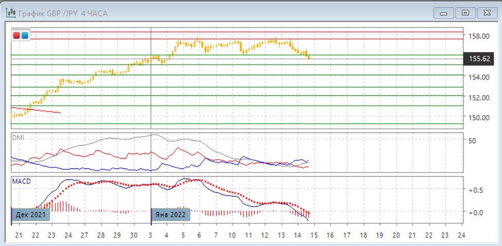 На дневном графике пара снизилась от предыдущего максимума января и сопротивления на 157,60. Теперь пара находится у нижней границы консолидации 156,00-157,60, и возможно закрытие ниже. Это было бы медвежьим сигналом, так как, если рассматривать "флаг" в диапазоне 156,00-157,60 после волны роста с 20 декабря, более вероятным направление выхода из него было продолжение роста. Движение же в противоположном предыдущей тенденции направлении может показывать её завершение. Также можно рассматривать образование двойной вершины у 157,60 - в таком случае, снижение ниже 156,00 является преодолением промежуточного минимума и медвежьим сигналом. По индикаторам направленного движения коррекция к росту: превышение DM+ над DM- сохраняется, коррекция видна по снижению гистограммы MACD и постепенному развороту линии MACD.