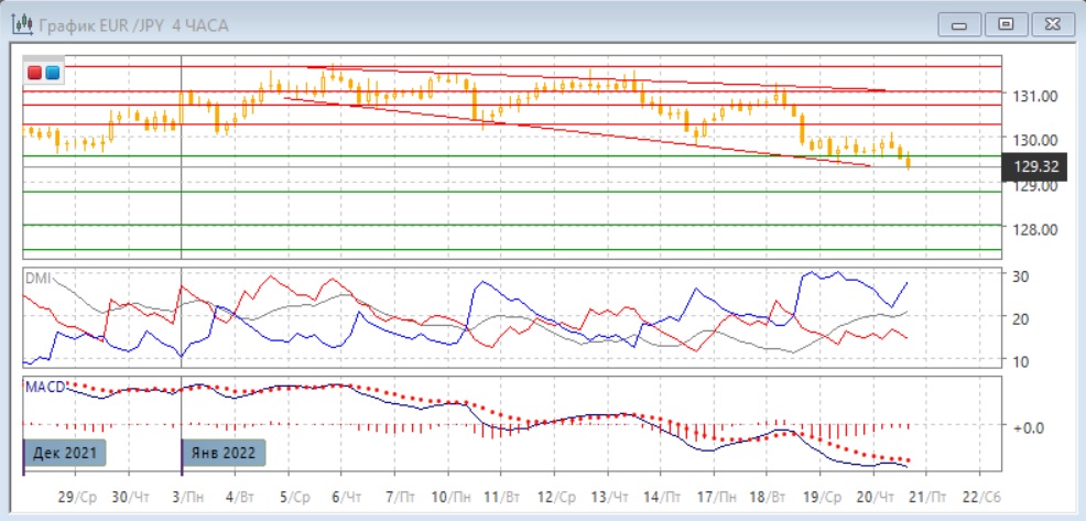 На четырёхчасовом графике пара находится ниже диапазона первой половины января. Текущая консолидация - между 129,55 и 130,00. Выход из неё более вероятен вниз, так как направление после боковика в начале января определилось. Пара остаётся в расходящемся треугольнике, который направлен вниз. У 130,00 образовалась небольшая падающая "звезда", что может быть сигналом ложного пробоя и увеличивать вероятность выхода из консолидации вниз. По индикаторам направленного движения тенденцией также стало снижение: DM- значительно выше DM+, уровень ADX восстановился, гистограмма MACD, несмотря на рост из-за стабилизации в диапазоне, остаётся в отрицательной зоне, линия MACD имеет отрицательный наклон.