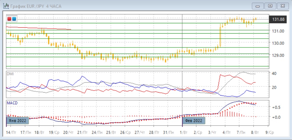 На четырёхчасовом графике пара получает поддержку на ранее преодолённом уровне сопротивления 130,60. Нижние тени последних свечей показывают, что снижение быстро выкупается. Краткосрочно пара, вероятно, вернётся к максимумам 4 февраля около 132,00. Так как коррекция, возможно, завершилась, возобновление роста является более вероятным. По индикаторам направленного движения коррекция к росту: превышение DM+ над DM- большое, ADX на высоком уровне, коррекция видна по снижению гистограммы MACD и развороту линии MACD.