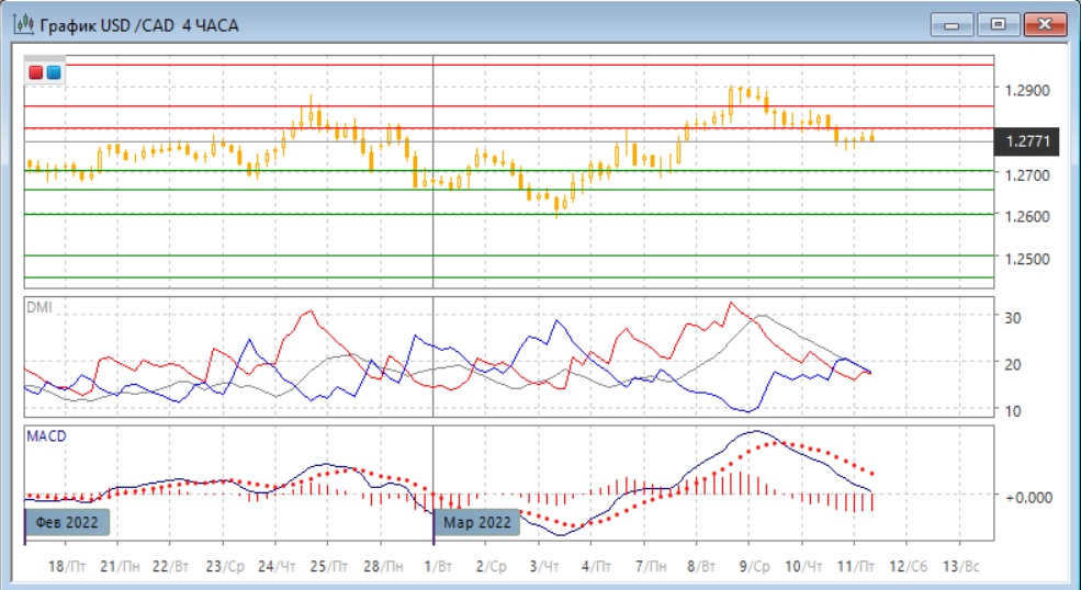 На четырёхчасовом графике уже произошёл разворот: относительные максимумы и минимумы сейчас снижаются, по более краткосрочным индикаторам направленного движения тенденцией стало снижение: гистограмма MACD в отрицательной зоне, линия MACD имеет отрицательный наклон. Уровень 1,2800 уже выступает сопротивлением, что облегчает дальнейшее снижение.