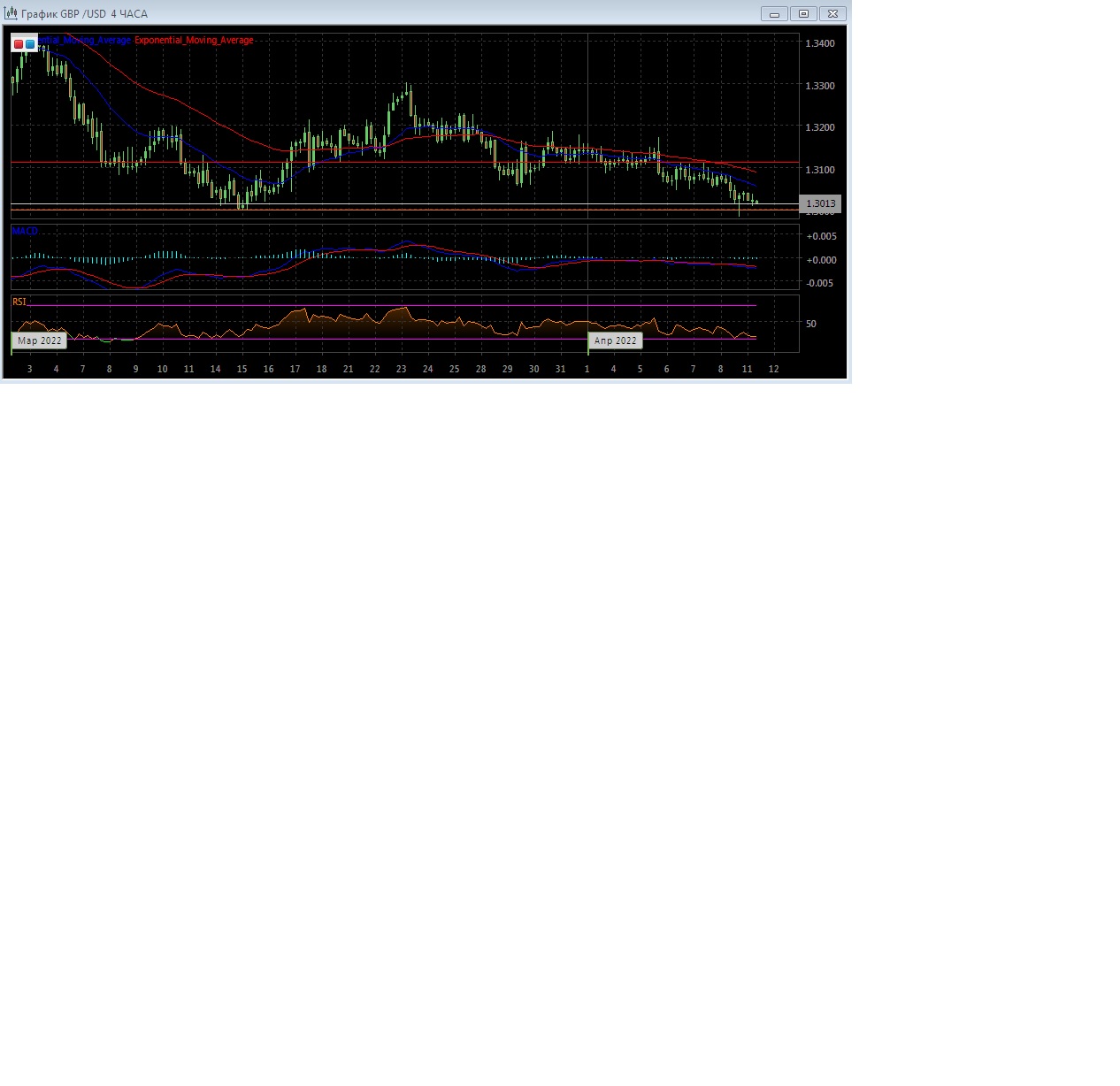 На четырёхчасовом графике скользящие средние продолжают двигаться вниз, увеличивая расхождение, что говорит в пользу нисходящей тенденции.