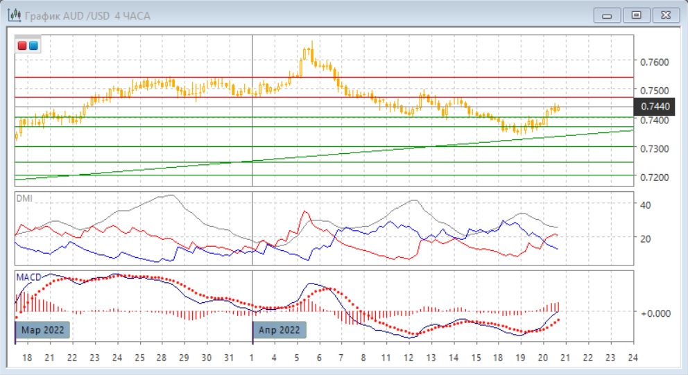 На четырёхчасовом графике пара перешла к росту после преодоления "круглого" уровня 0,7400. Относительные максимумы и минимумы пары сейчас последовательно растут, по индикаторам направленного движения тенденцией стал рост: DM+ выше DM-, гистограмма MACD растёт в положительной зоне, линия MACD получила положительный наклон. При откате пара может получить поддержку на ранее преодолённом "круглом" уровне 0,7400. Пока пара выше этого уровня, краткосрочно более вероятным кажется достижение ближайшего сильного сопротивления на 0,7470.