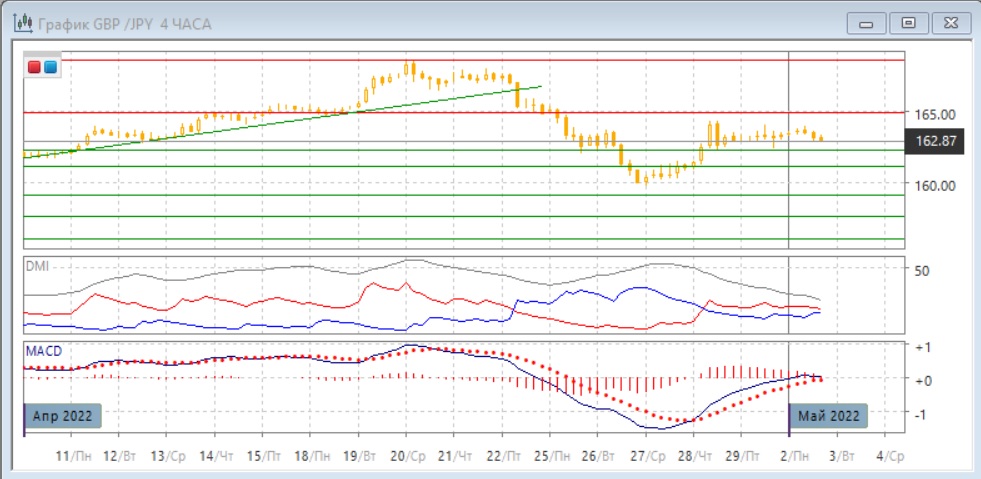 На четырёхчасовом графике ситуация скорее нейтральная: пара находится существенно ниже важного в этом масштабе сопротивления на 165,00 (ниже него образовалось уже три относительных максимума), но преодоления поддержки на 162,30 также не произошло. Другим сигналом нейтрального положения является образование многих свечей "дожи". Учитывая более широкую картину (снижение с 20 апреля) более вероятным видится снижение к 162,40 и выход из текущего диапазона вниз. Однако если пара преодолеет уровень 165,00, это изменило бы картину.