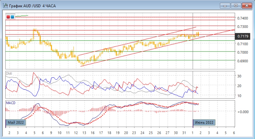На четырёхчасовом графике остаётся ниже "круглого" уровня 0,7200, который тестируется третий день. Быстрое возвращение ниже этого уровня 1 июня может быть ложным пробоем, которые сделает более вероятным преодоление линии тренда и дальнейшее снижение. То, что пара не достигает в последней волне верхней границы канала, является медвежьим признаком. Дальнейшее движение, вероятно, будет в сторону выхода пара либо выше 0,7200 (тогда продолжение роста предпочтительно), либо ниже линии тренда (это изменило бы краткосрочную тенденцию).