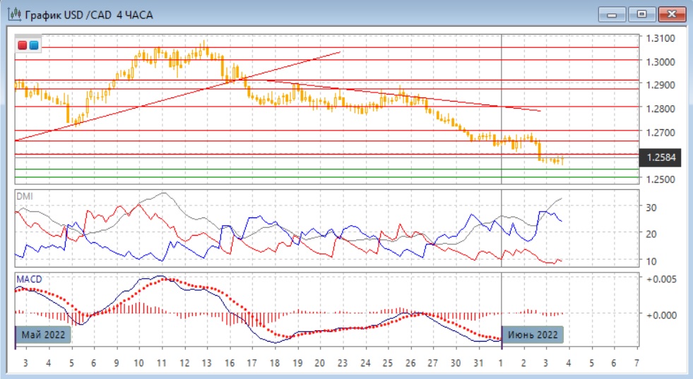 На четырёхчасовом графике видно замедление снижения, хотя это происходило и самом начале июня, но не остановило снижения. Образовалось бычье расхождение минимумов пары и гистограммы MACD. Это сигнал не имеет подтверждения. Им могло бы стать восстановление выше ближайшего "круглого" уровня 1,2600. По ADX тенденция снижения очень сильная: превышение DM- над DM+ очень большое при высоком уровне ADX. Дальнейшее движение в краткосрочной перспективе, вероятно, будет в сторону выхода либо выше 1,2600, либо ниже 1,2530.