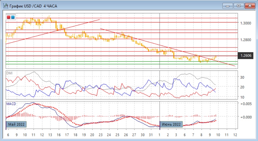 На четырёхчасовом графике скорее виден уже разворот: пара закрепилась выше нисходящей линии тренда с конца мая. Она почти достигла предыдущего максимума, и при преодолении 1,2600 преодолела бы его, что нарушило бы последовательность снижения относительных максимумов. По индикаторам направленного движения тенденция меняется: DM+ теперь выше DM-, гистограмма MACD находится в положительной зоне, линия MACD имеет положительный наклон.