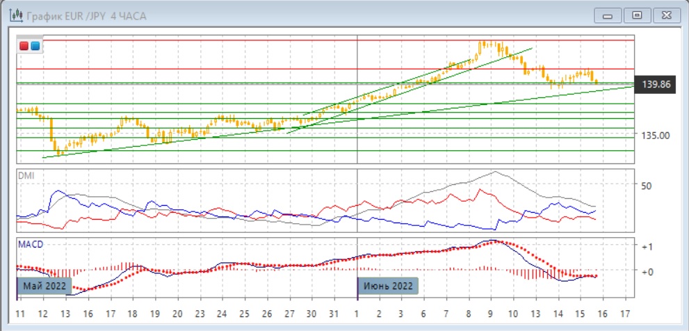 На четырёхчасовом графике пара снижается от сопротивления на 141,40, она достигла уровня поддержки 140. Снижение замедлилось, но тенденция сохраняется: относительные максимумы и минимумы снижаются, по ADX тенденцией остаётся снижение: DM- выше DM+. Замедление видно по возвращению гистограммы MACD к нулевому уровню, линия MACD стала почти горизонтальной. Линия тренда сейчас видится ближайшей целью.