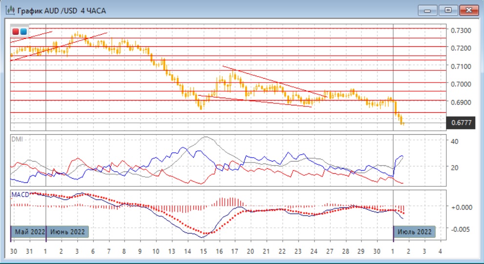 На четырёхчасовом графике после стабилизации около уровня 0,6900 в конце июня пара резко снизилась от этого уровня в начале июля, при этом были преодолены важный уровень поддержки 0,6835 и "круглый" уровень 0,6800. Так как пара легко преодолела эти уровни и движение ускорилось, продолжение снижения сейчас кажется более вероятным, так как рынок, кажется, определился с краткосрочным направлением. Относительные максимумы и минимумы пары продолжают снижаться. По ADX тенденция снижения усилилась: превышение DM- над DM+ значительно увеличилось, уровень ADX вырос.