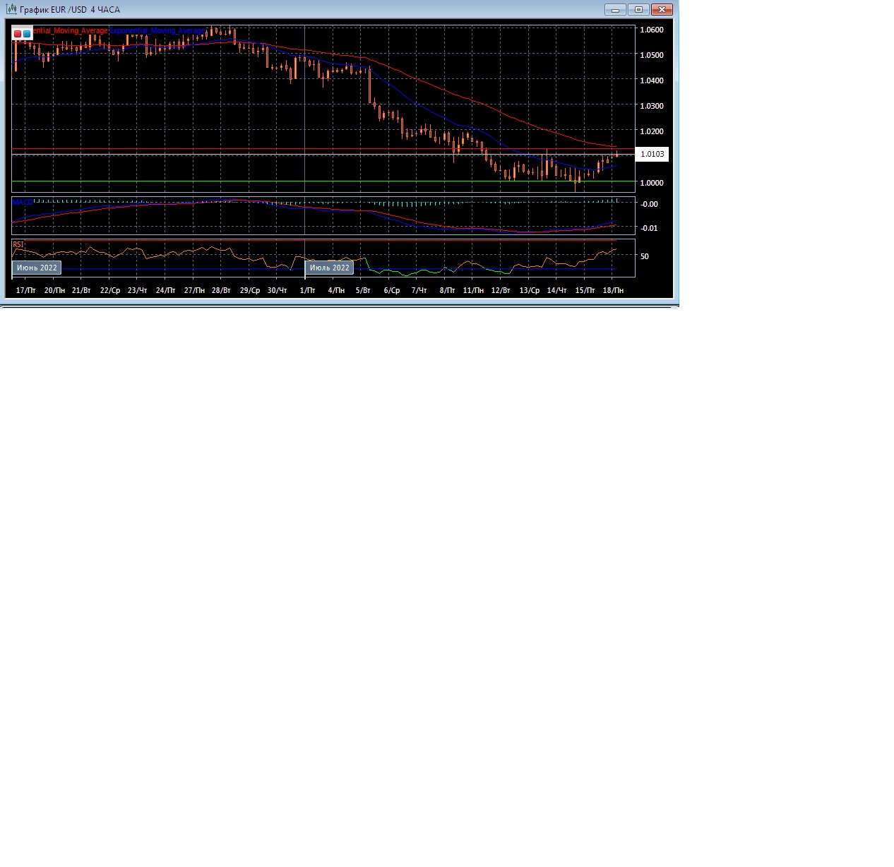 На торгах в Азии в понедельник валютная пара EUR/USD торгуется с небольшим понижением котировок и уровнем поддержки в районе 0.9998 при уровне сопротивления в районе 1.0127. Четырёхчасовой график развивается между экспоненциальных скользящих средних, демонстрируя медвежий потенциал текущей рыночной тенденции в краткосрочной перспективе.