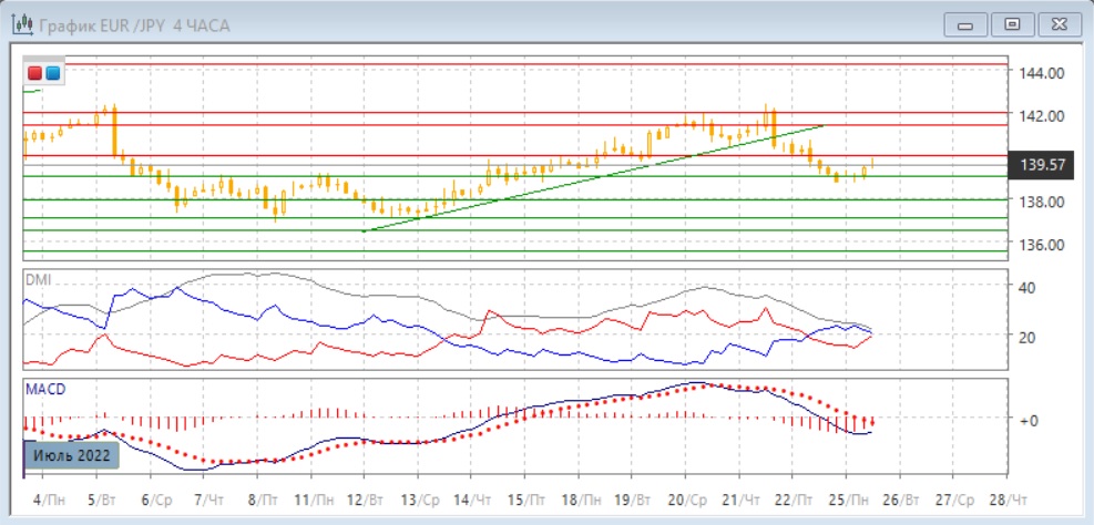 На четырёхчасовом графике отскок вверх остановится у уровня сопротивления 140,00. Последовательность снижения относительных максимумов пары не нарушена. Если предполагать завершение коррекции, то пара скорее вернётся к исходной точке коррекции ниже 139,00. При преодолении уровня 139,00 следующая сильная поддержка только на 137,00. Самое преодоление уровня 139,00 может быть хорошим медвежьим сигналом, так как в июле это важный уровень поддержки/сопротивления.