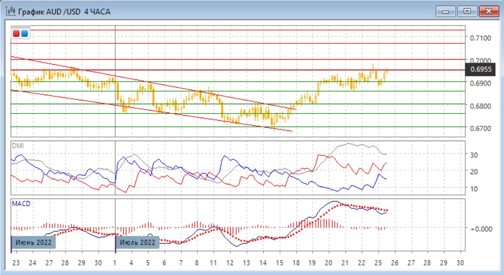 На дневном графике пара после выхода из нисходящего канала приблизилась к психологически важному уровню 0,7000, и при откате от него получила поддержку на ближайшем "круглом" уровне 0,6900. Учитывая восстановление, скорее уровень 0,7000 будет тестироваться. Восстановление выше уровня поддержки 0,6860 делает дальнейший рост предпочтительным вариантом, так как здесь находится сильная поддержка, проявившаяся в мая и июне. По индикаторам направленного движения продолжается разворот: DM+ теперь выше DM-, гистограмма MACD растёт в положительной зоне, линия MACD имеет положительный наклон.