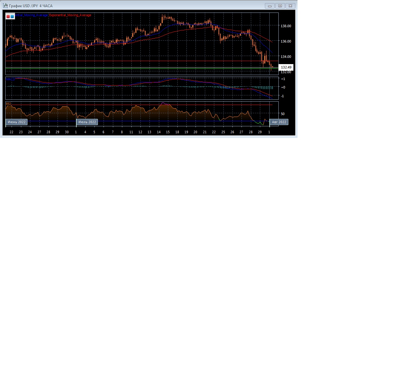 Скользящие средние с периодом 21 и 55 дней продолжают движение вниз, ускоряясь и увеличивая расхождение. Четырёхчасовой график по-прежнему прогрессирует в области значительно ниже экспоненциальных скользящих средних, что свидетельствует о хорошем, медвежьем потенциале этого рынка.