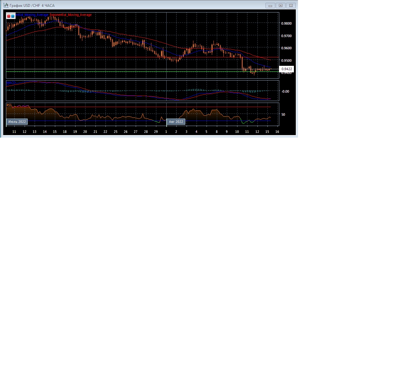 На четырёхчасовом графике скользящие средние с периодом 21 и 55 продолжают движение вниз, постепенно увеличивая расхождение, что говорит в пользу развития нисходящего тренда на этом рынке. Четырёхчасовой график котировок прогрессирует ниже экспоненциальных скользящих средних, что является свидетельством медвежьего потенциала данного рынка в краткосрочной перспективе.