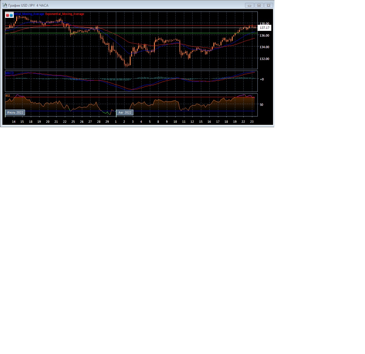 Скользящие средние с периодом 21 и 55 дней продолжают движение вверх, увеличивая расхождение. Четырёхчасовой график прогрессирует в области заметно выше экспоненциальных скользящих средних, что свидетельствует о продолжении восходящего движения этого рынка в краткосрочной перспективе.