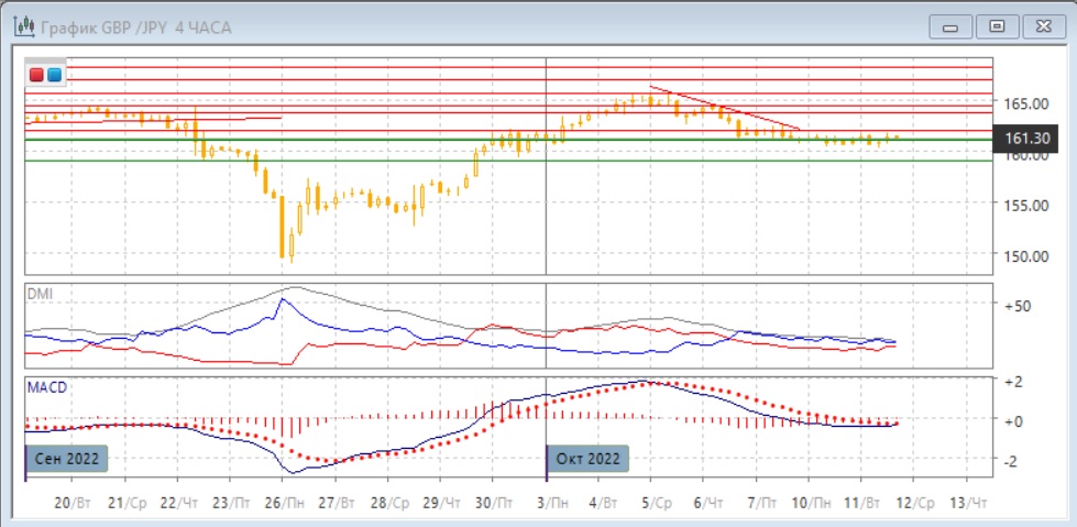 На четырёхчасовом графике пара стабилизировалась около уровня 161,10. Это может продолжаться до выхода в четверг ключевых данных недели - по индексу потребительских цен в США. До этого момента новостных поводов для выхода из текущего флэта не видно. Дальнейшее движение, вероятно, будет в сторону отхода от 161,10. По индикаторам направленного движения флэт: гистограмма MACD около нуля, линия MACD близка к горизонтали, и хотя DM- выше DM+, разрыв между ними невелик.
