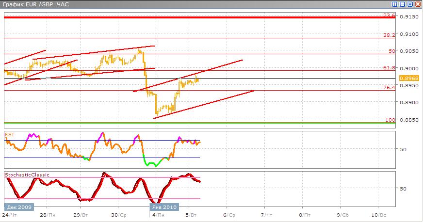 Данная пара пробивает свой восходящий канал вниз, сейчас строя новый восходящий канал, находясь в нем у верхней его границы торгуется сейчас между 76,4% и 61,8% по Фибоначчи возможен вариант при котором будет отскок от этой верхней границы и небольшая коррекция вниз, а после новой движение вверх. В альтернативном варианте торговый канал может быть пробит наверх и резкий уход к уровням 61,8 и 50% по Фибоначчи. Торговые индикаторы показывают сигнал к продаже этой пары Stohastic пересекается скользящими средними в сторону продажи выходя из зоны перекупленности, а RSI также выходит из зоны перекупленности и направляется вниз.