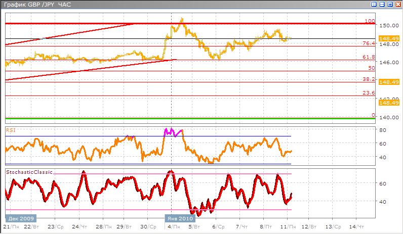 Валютная пара прогноз оправдался и валютная пара продолжает находится между уровнями 100% и 76,4% по Фибоначчи, скорее всего, дальнейшая торговля будет проходить подобным образом.Такая ситуация создалась за счет разнонаправленного движения двух валютных пар составляющих этот кросс-курс. Классические индикаторы показывают сигнал к покупке по Stohastic довольно четкий сигнал к покупке после разворота от зоны перепроданности он пересекаясь двумя скользящими указывает на начало покупки, а RSI сейчас торгуется возле середины своего значения не давая определенных сигналов, что указывает на то, что движения будут не сильными.