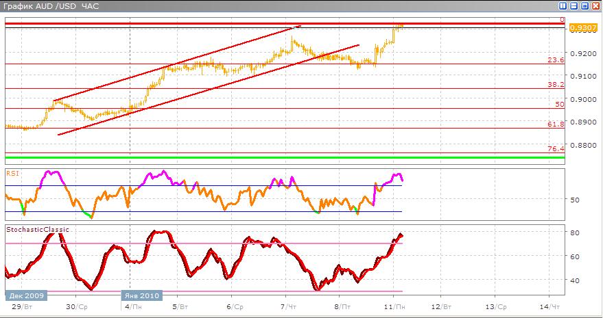 Австралийский доллар пробил свой восходящий канал в нижней точке, но после этого не растерял возрастающего импульса и сейчас отправился к прошлогодним максимумам года, и находится возле линии сопротивления намереваясь ее пробить, возможно ему хватит сил это сделать, но после этого ожидается откат к 23,6% по Фибоначчи. Стандартные индикаторы торговли указывают что сила покупки иссякает и вот вот начнется сигнал к продаже данной пары. Stohastic начинает пересечение сверху вниз в зоне перекупленности, означающее, что появляется сигнал к продаже, RSI также находится в зоне перекупленности и начинает разворот в обратную сторону.
