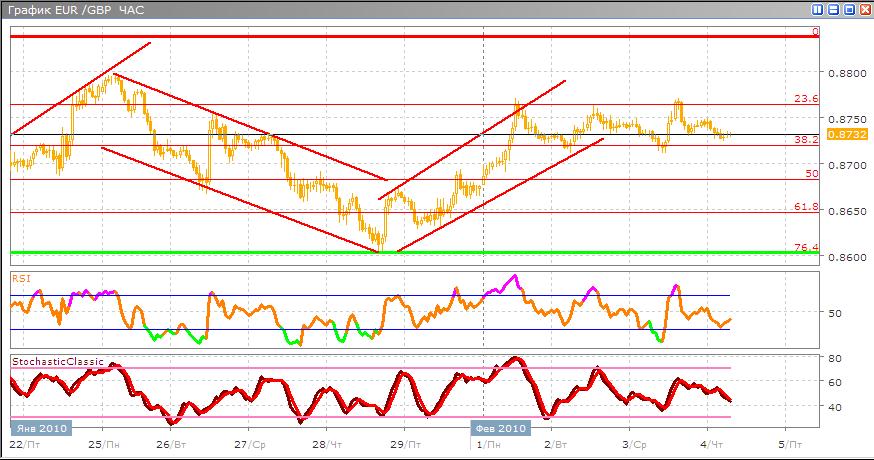 Данная валютная пара после отскока от линии поддержки создала восходящий канал, сейчас произошел прорыв данного канала и текущий тренд можно назвать боковым. Торговля проходит между 38,2% и 23,6% по Фибоначчи. Скорее всего текущее боковое движение будет сохранено. В альтернативном варианте возможно, что боковой тренд закончится и начнется движение наверх. Торговые индикаторы указывают нам, разнонаправленный сигнал, Stohastic направлен вниз, после нескольких пересечений. RSI находится ближе к перепроданности, но при этом направлен вверх.