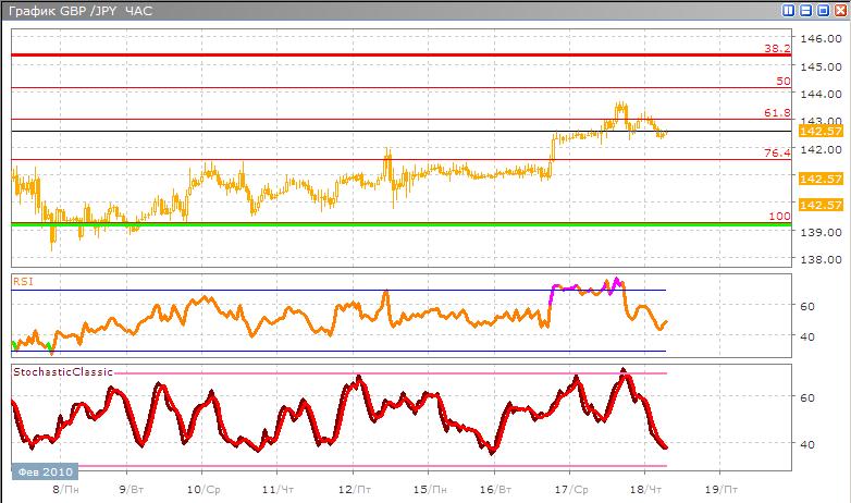Торговая валютная пара немного подросла и сейчас она находится между 76,4% и 61,8% по Фибоначчи. Скорее всего эта пара продолжит немного подрастать и следующей точкой будет 50% по Фибоначчи. В альтернативном варианте торговля вернется ближе к линии поддержки. Классические индикаторы показывают продолжение сигнала к продаже, Stohastic после пересечения своих скользящих направлен вниз, а RSI выйдя из зоны перекупленности направлен вниз, хотя также возможно формирование противоположного сигнала к покупке.