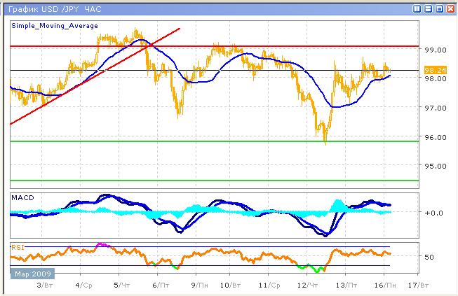 На сегодняшних торгах ожидается продолжение укрепления японской валюты против доллара США, чему способствуют фундаментальные факторы. Несмотря на оптимизм на фондовых рынках, пара все же находится под давлением, после сообщений правительства о разработке нового стимулирующего плана, который, вероятно будет направлен на облегчение обстановки на кредитном рынке, что позволит, в значительной степени, реанимировать корпоративный сектор. Технические индикаторы сигнализируют о предстоящем снижении. Осциллятор MACD подает слабый сигнал к продаже, при этом скользящие средние индикатора, снижаются, часто пересекаясь между собой. График индикатора RSI еще не пересек среднюю линию, но достаточно ясно дает понять, что бычий тренд выдохся.