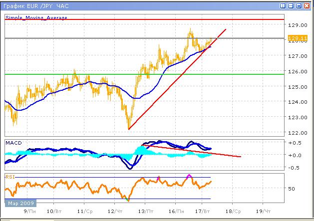 Пара преодолела уровень сопротивления, продолжает рост, нацелившись на очередную высоту. Однако совершенно очевидно, что рост замедлился, и быки демонстрируют признаки слабости. На этой неделе ожидается тестирование следующего уровня сопротивления, после чего пара начнет снижаться. В настоящий момент индикаторы только начали сигнализировать о слабости покупателей, если спустя несколько часов индикаторы дадут сигналы на продажу, то в дальнейшем будет завиваться зигзагообразная коррекция. На часовом графике осциллятор MACD демонстрирует медвежье расхождение, что является достаточно надежными разворотным сигналом.