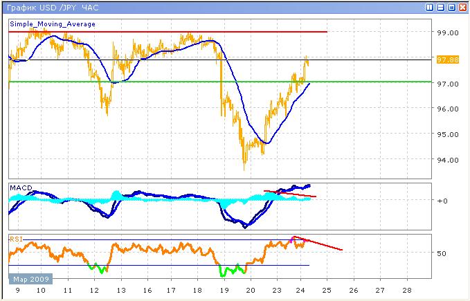 Нисходящий тренд внезапно завершился, вследствие действий американских властей по стимулированию финансовой системы. На фоне роста фондовых индексов интерес инвесторов к японской валюте значительно сократился, что выразилось ее падением против доллара США, который также находился под давлением продаж. Цена снова приближается к уровню сопротивления 99.00, который тестировался ранее, однако в краткосрочном планировании, пара будет снижаться, о чем говорят технические средства анализа. Ценовой график демонстрирует рост, в то время как график индикатора RSI развивается в области перекупленности, и гистограмма MACD снижается к нулевой оси. Оба индикатора демонстрируют начальную фазу медвежьей дивергенции. Сигналом к действиям для участников торгов по данной паре должна стать динамика торгов на фондовых рынках.
