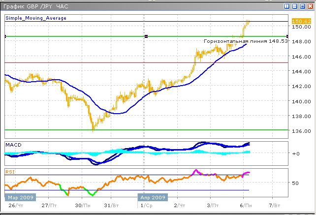 Текущий активный рост едва ли изменит настроения в ближайшее время, поскольку в среднесрочном плане паре оказана поддержка технических факторов, что достаточно красноречиво видно на 4-часовом графике. В краткосрочном же планировании, наиболее вероятен рост, после непродолжительной коррекции. Цель кратковременного снижения расположена у отметки 149.60, которая соответствует идеям, взятым из свечного анализа, в теории окон. В обозримом будущем ожидается формирование вершины, которая будет иметь пик вблизи уровня сопротивления 152.00. В настоящий момент технические индикаторы указывают на продолжение роста, вследствие активности покупателей, моментум восходящего тренда растет, что иллюстрирует гистограмма MACD, однако, график индикатора RSI находится в зоне перекупленности. Решение данного факта быками может быть только путем коррекции.