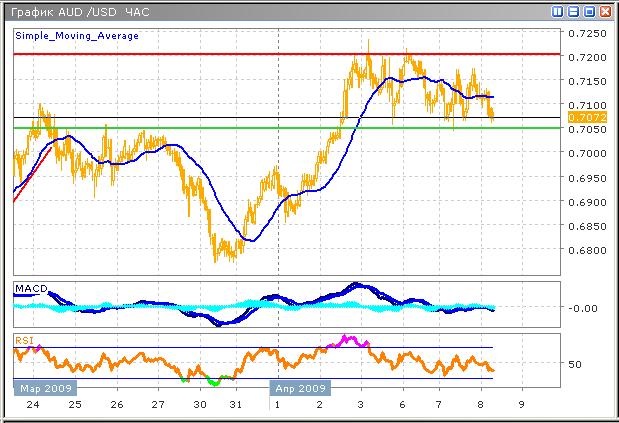 Возрастающий тренд встретил на своем пути уровень сопротивления 0.7200, который ранее неоднократно тестировался, и который, вероятно будет преодолен в среднесрочном плане, после завершения неглубокой коррекции. Активность быков значительно снизилась, однако, фундаментальные данные указывают на предстоящее укрепление пары, текущее мало активное снижение отражает неуверенность инвесторов, которые вынуждены покупать доллар США, вследствие давления продаж на фондовых рынках. Индикатор MACD иллюстрирует отсутствие активности как продавцов, так и покупателей, и предупреждает участников рынка о краткосрочном развитии тренда в узком канале нисходящего направления. График индикатора RSI не дает оптимистичных прогнозов, но напротив пересекает среднюю линию в нисходящем направлении, подавая сигнал на продажу, однако, учитывая его динамику на протяжении предшествующих нескольких дней, такой сигнал не является надежным. В течение сегодняшней сессии, наиболее вероятно снижение к поддержке, после чего продолжится краткосрочный рост.