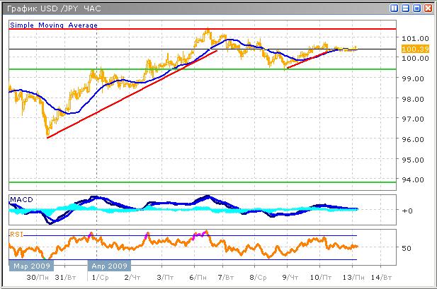 Прогноз роста цен по данной паре подтвердился, в течение сегодняшнего дня ожидается слабый рост, поддержанный настроениями инвесторов. Боковое движение, вероятно, продолжится в среднесрочной перспективе, в обозначенном ранее коридоре 99.30 – 101.30. В течение прошедших двух месяцев, динамику торгов на валютной рынке определяют тенденции фондовых рынков, которые являются достаточно точным индикатором состояния экономики, и отражают ее перспективы. Гистограмма осциллятора MACD уже длительное время находится у нулевой отметки, что отражает отсутствие идей на рынке. График индикатора RSI находится под средней линией, с переменным успехом пытаясь пересечь ее. Настоящий момент на является подходящим временем для входа в рынок, рекомендуется ориентироваться на фундаментальные сигналы.