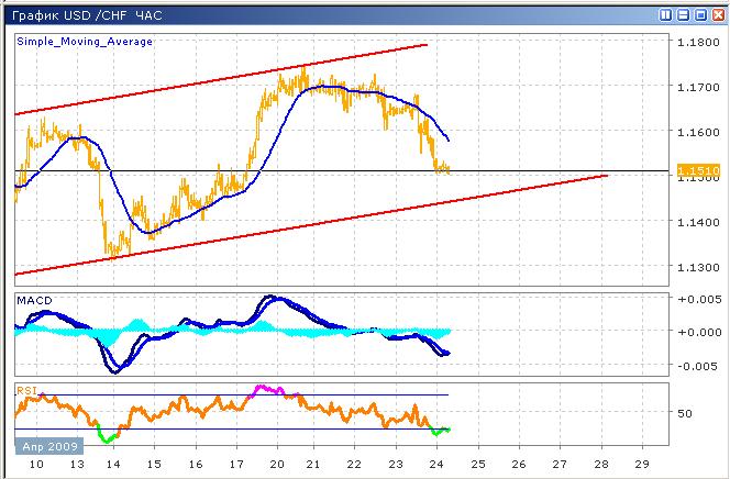 Снижение пары было широко ожидаемо участниками торгов, соответствии с ожиданиями, она продолжила торги в пологом восходящем канале, результатом чего и стало снижение,как как отражение от верхней границы. Участники торгов не воздерживаются от активных действий, поэтому торги протекают достаточно нервно, приближая стремительно цену к противоположной границе канала, отражая тенденции фондового рынка США. Технический анализ указывает на краткосрочное восстановление. В любом случае, долгосрочная тенденция является возрастающей, поэтом открытие длинных позиций более приоритетно, нежели продажи, однако, все же лучше дождаться более глубокого снижения цены. График индикатора RSI находится в зоне перепроданности, что повышает потенциал к краткосрочному росту. Гистограмма MACD формирует локальный минимум в отрицательной зоне, пересекая при этом снизу вверх нулевую линию, что в совокупности дает достаточно надежные сигналы к росту на короткий срок.