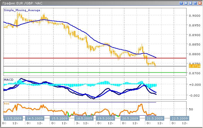 Наиболее вероятно, что пара продолжит падение, по меньшей мере, к отметке 0.8700 после чего, ожидается коррекция. В дальнейшем, рост британской валюты будет более глубоким против доллара по той причине, что фунт недооценен в настоящий момент. Проведя технический анализ пары, отмечаем, что имеем большинство сигналов на продажу. Индикатор MACD продолжает наращивать моментум нисходящего тренда. Ценовой график пересек скользящую среднюю с периодом 26, а график индикатора RSI тестирует область перепроданности. Поскольку фундаментальная причина текущих движений не отличается ясностью, цели снижения не рекомендуется отмечать слишком низко. Наиболее вероятно, что коррекция будет иметь сложную конфигурацию,в сравнении с простой треугольной. Среднесрочной целью снижения рационально наметить ближайшую поддержку.