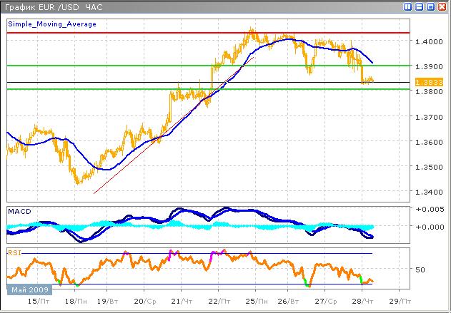 Возрастающий тренд встретил на своем пути довольно сильное сопротивление у отметки 1.4030 и завершился неполным формированием разворотной графической фигурой двойная вершина, на фоне коррекции фондовых рынков. Покупатели стремительно сдают позиции, в результате чего ожидается тестирование поддержки 1.3800. На часовом графике технические индикаторы указывают на замедление нисходящего тренда, и предстоящую краткосрочную коррекцию, по завершению которой, пара продолжит более спокойное снижение. Осциллятор MACD близок к подаче двойного сигнала к покупке, с одной стороны пересекая гистограммой нулевую ось, с другой стороны, скользящие средние пересекаются таким образом, что также подают сигналы на покупку. График индикатора RSI находится на верхней границе области перепроданности, вследствие чего можно полагать, что потенциал снижения сокращается.